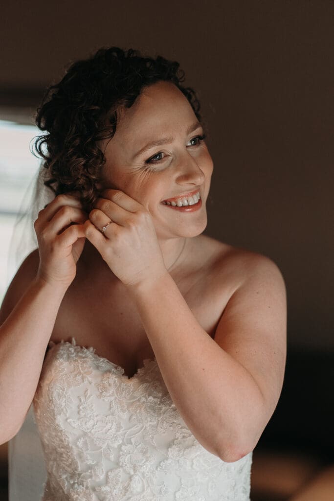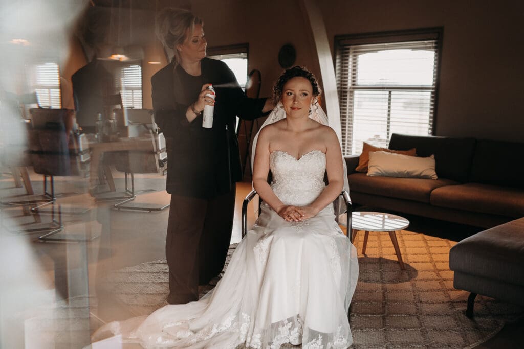 Daarna was het tijd voor de bruid, die al vanaf 08.00 in de haar en make-up zat. Na een lekkere lunch ging de jurk aan. Echt een plaatje. En toen was het tijd voor de first look met haar vader.