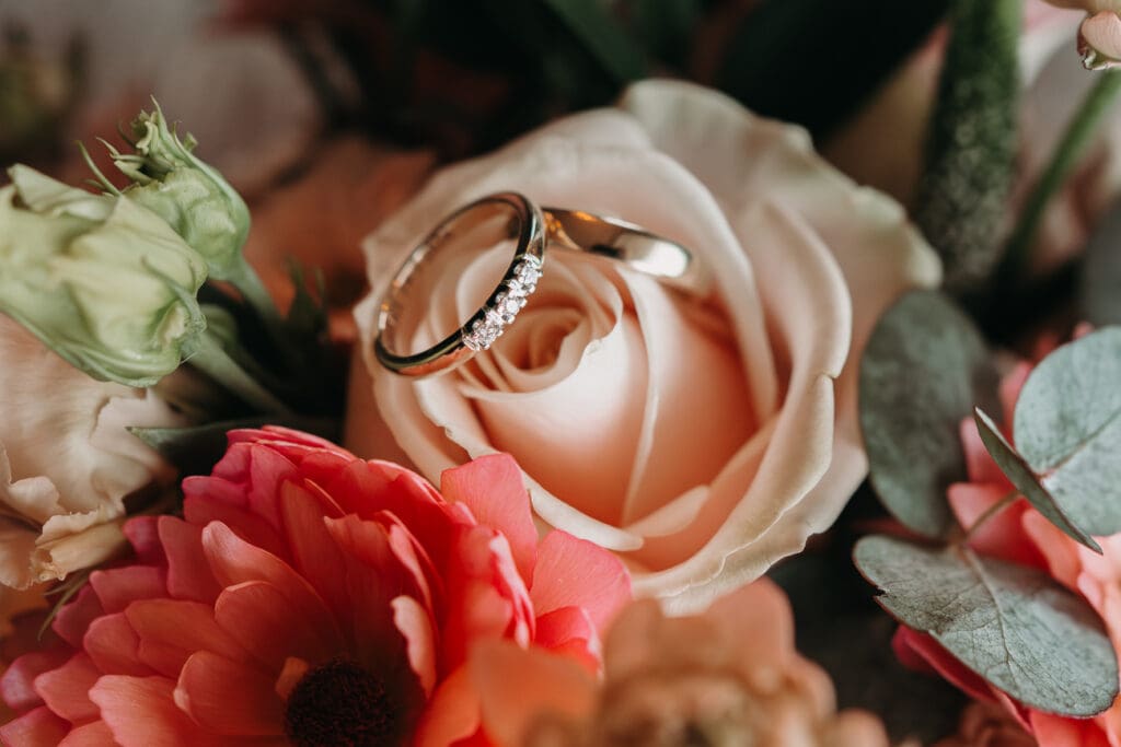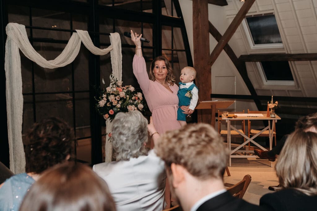 Na het diner was het tijd voor de ceremonie, en dit was er eentje hoor! De ceremonie werd geleid door ceremoniespreker Sabine van Wijk die er een persoonlijk en warm verhaal van maakte! Het absolute hoogtepunt was toch wel het moment dat hun zoontje de ringen kwam brengen. Hij had het niet beter kunnen doen!