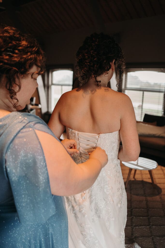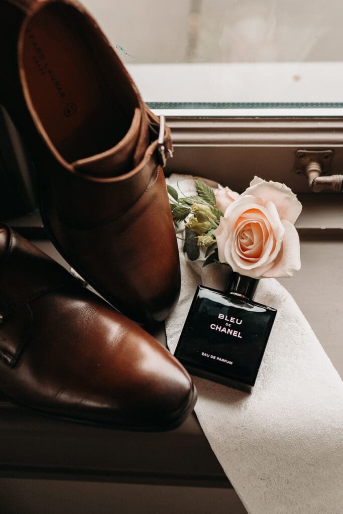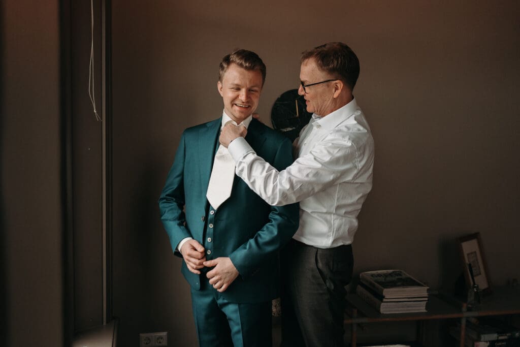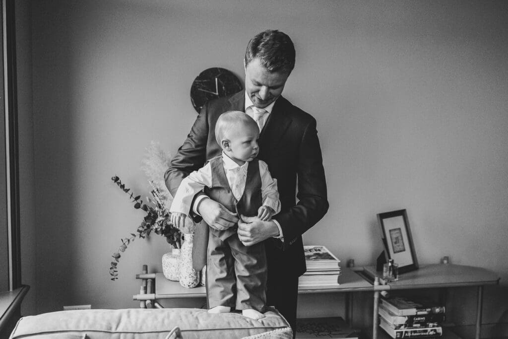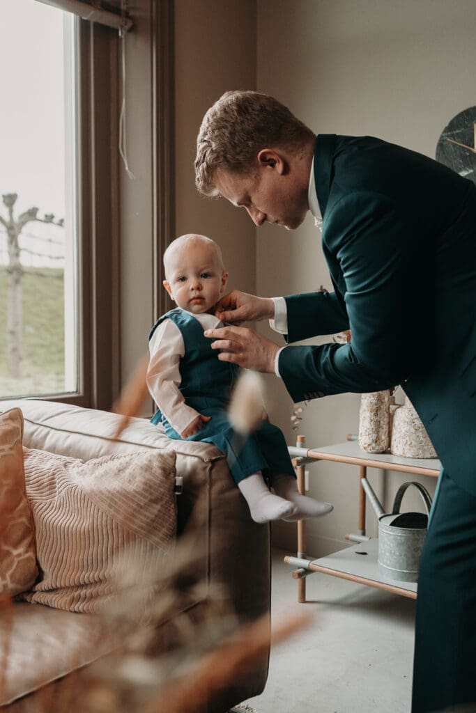 De hele dag vond plaats op één locatie, wat altijd zorgt voor rust en een fijne planning. We begonnen met het klaarmaken van de bruidegom en hun zoontje. Een fijn en ontspannen begin, waarin de bruidegom hulp kreeg van zijn moeder en vader.